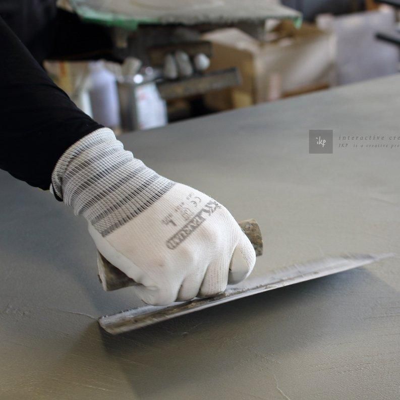 専門の職人が左官仕事によるモールテックスの練り付けを行います。またアイアンフレームは鉄加工と溶接による鉄専門の職人が製作。プロの職人の技術がギュッと詰まった唯一無二のダイニングテーブルです。